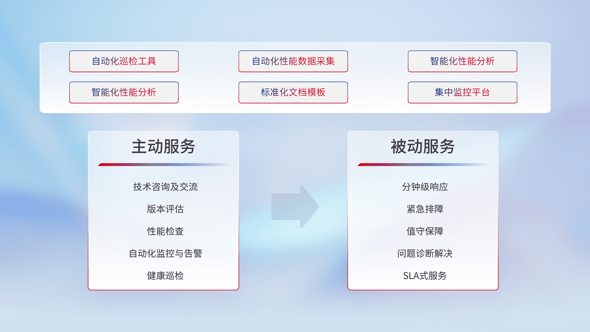 智能化工具和标准化文档,,保障服务质量,,,,提供主动服务(包含技术咨询、、、、版本评估、、、性能检查、、、、自动化监控与告警、、、健康巡检)和被动服务包含(分钟级响应、、、、紧急排障、、、值守保障、、、问题诊断解决、、、、SLA服务)。。。。