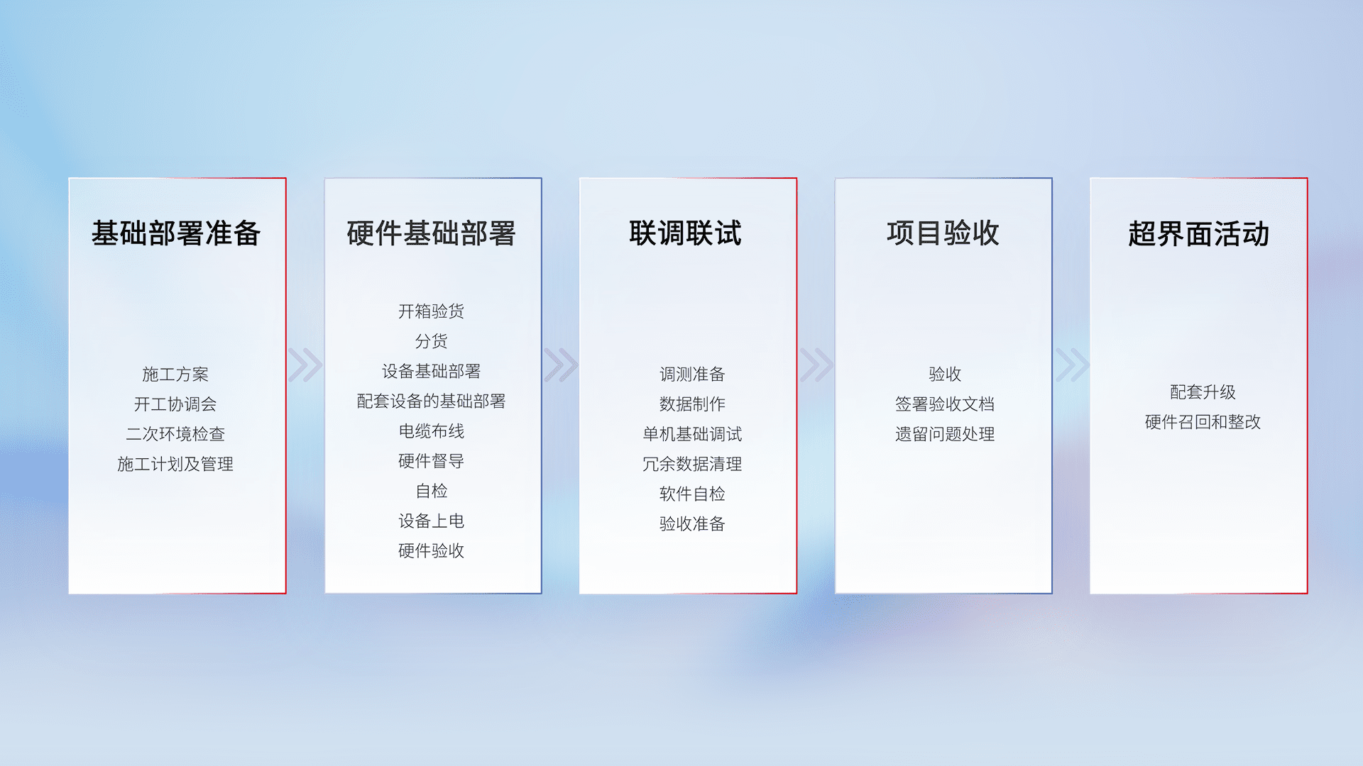 从基础部署准备、、硬件基础部署、、、、联调联试、、项目验收、、、、越界面活动的全过程可追溯,,,,保证施工质量和进度。。。。